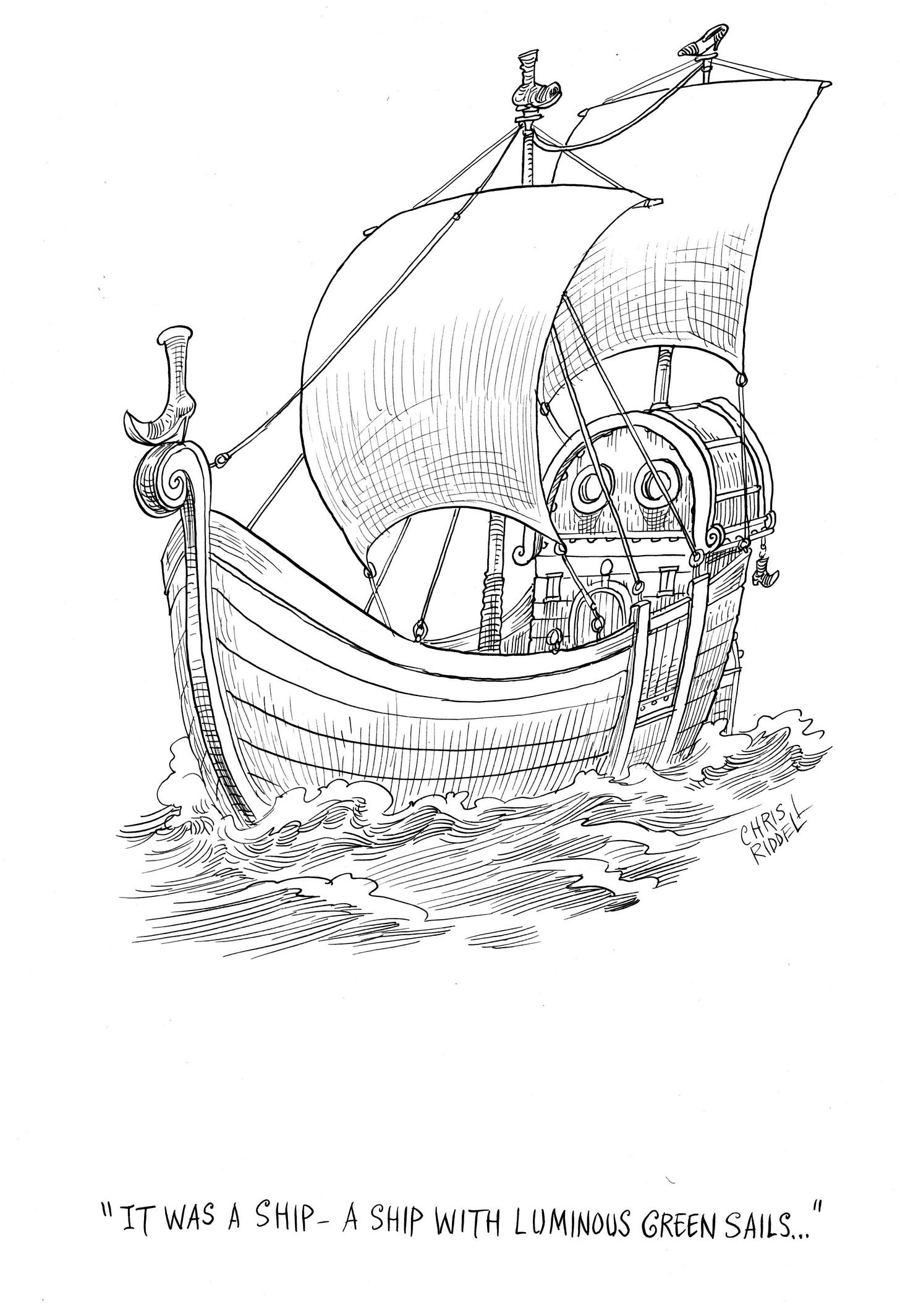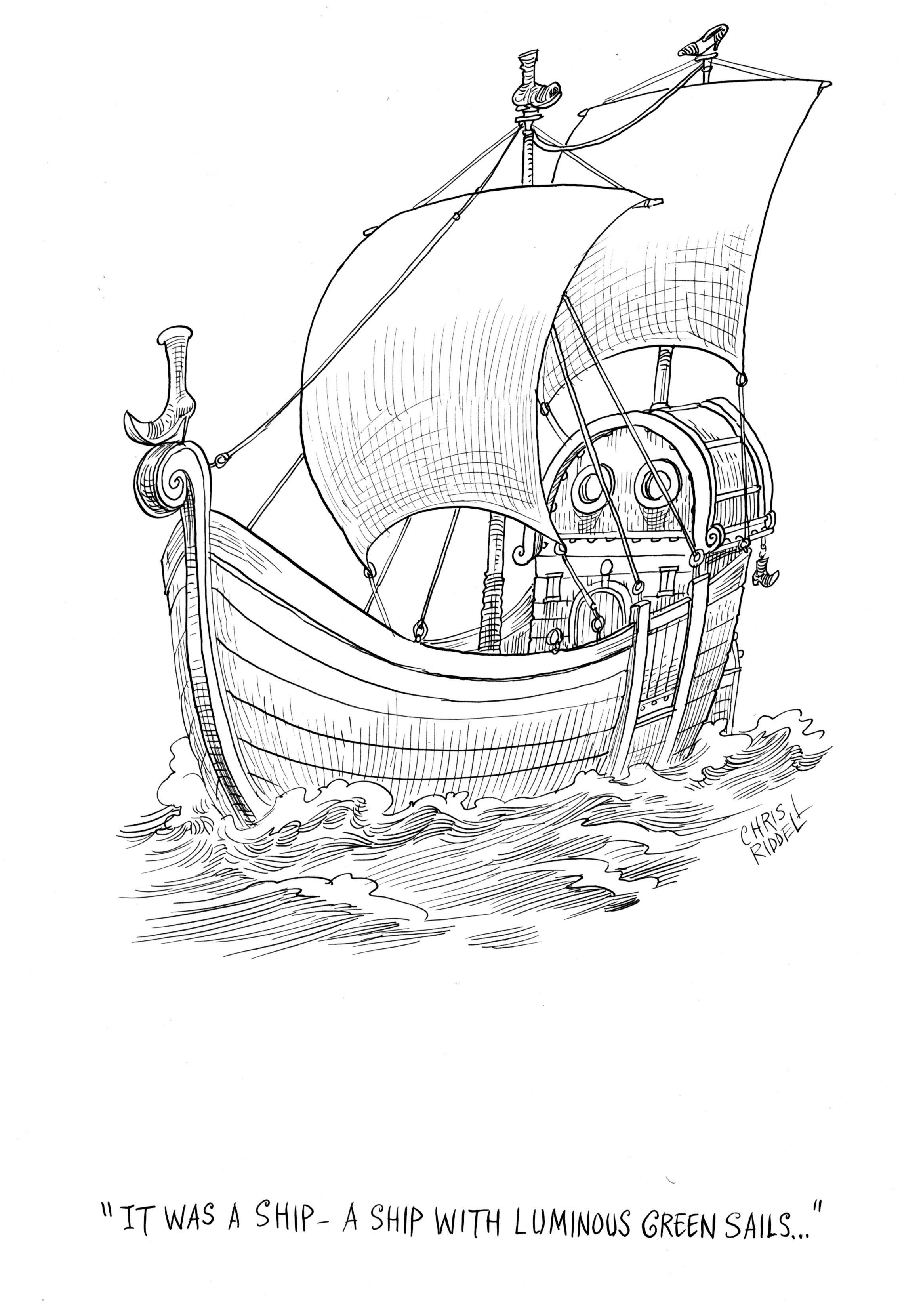 It was a ship — a ship with luminous green sails and ropes with eyelets which scraped from the hull.