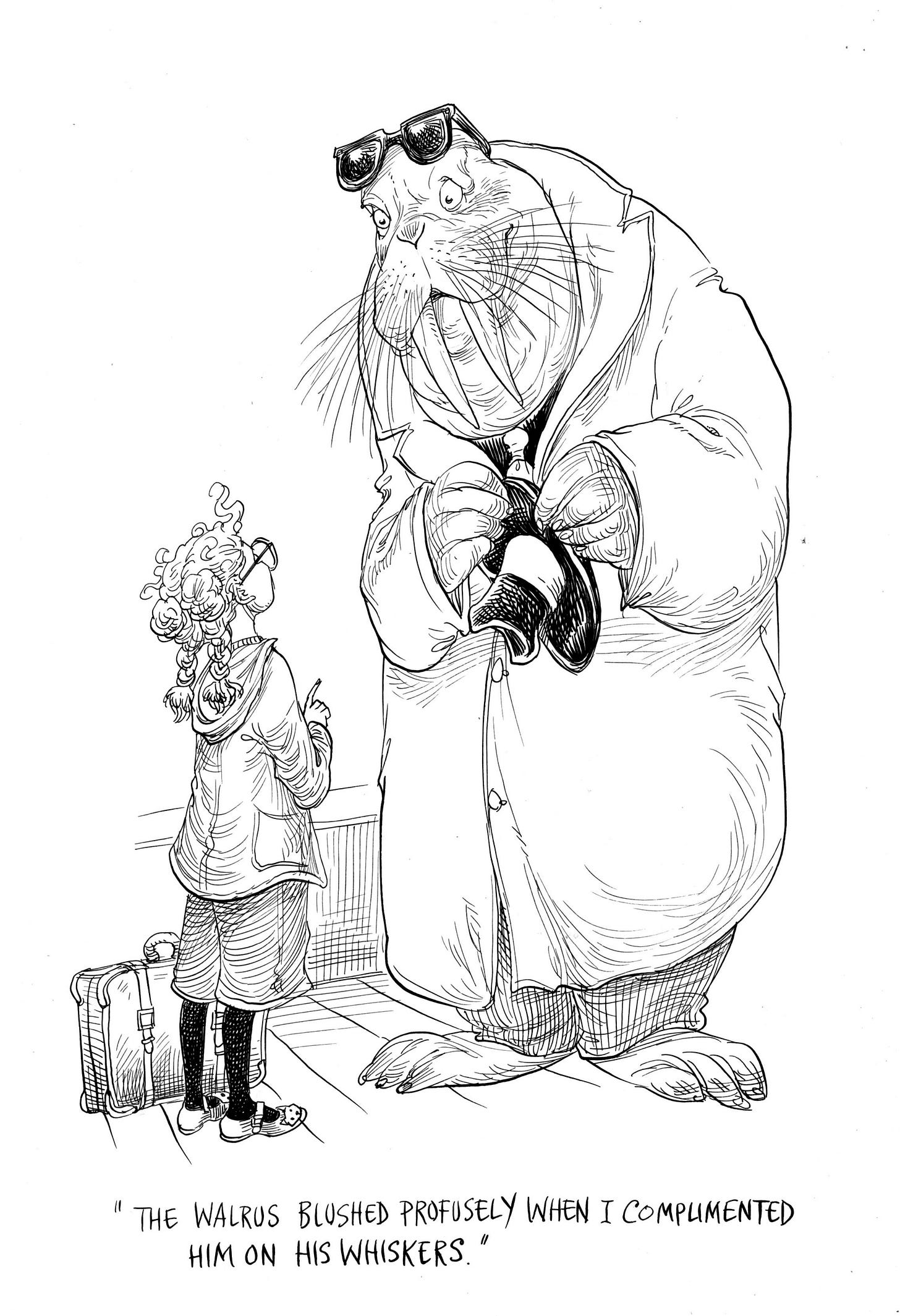 In his absence, I practised flattering my boat-van-mates, and complemented everything from beards to portmanteaus. They were quite pleased, I think, and the walrus blushed profusely when I complimented his whiskers. He promptly asked for my hand in marriage but I told him that, while flattered, I was not interested at this present time.